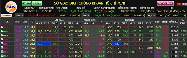 – Màu sắc: vàng là giá tham chiếu, xanh lá cây là giá tăng so với giá tham chiếu, tím là giá trần, đỏ là giá giảm so với tham chiếu và xanh da trời chính là giá sàn. Nhìn chung qua chuyển động của màu sắc chúng ta có thể cảm nhận được sự dịch chuyển lên xuống chung của thị trường rất rõ (tính dao động).